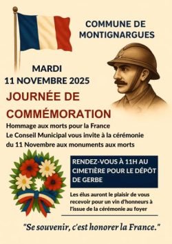 Montignargues – 11h00 au cimetière La commune de Montignargues organise sa cérémonie du 11 Novembre en hommage aux Morts pour la France. Le rassemblement se tiendra à 11h au cimetière, suivi du dépôt de gerbe au monument aux morts. À l’issue de la cérémonie, un moment convivial sera proposé aux participants.